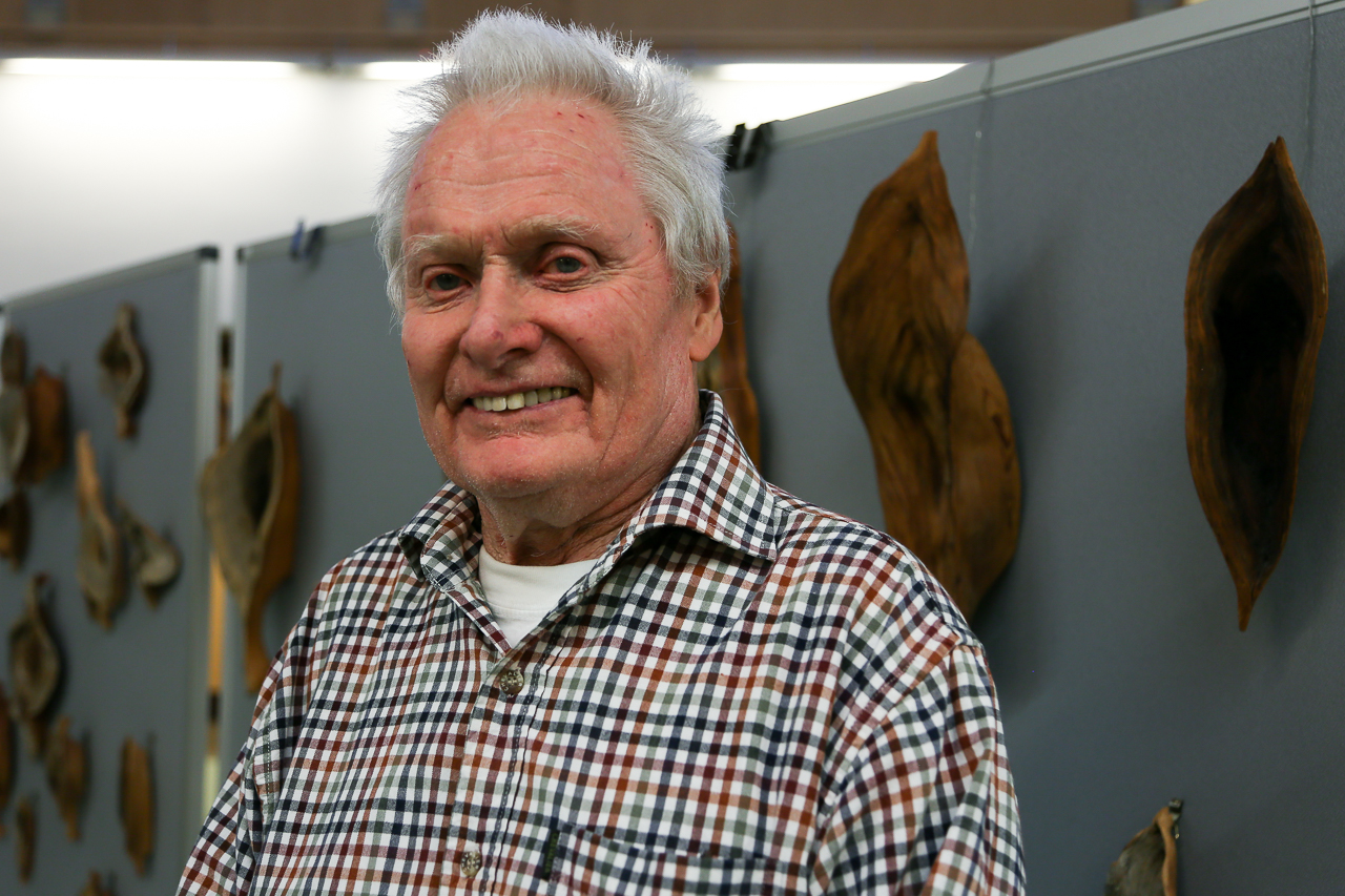 Evert Eriksson är tillbaka i Härjedalen och ställer just nu ut sin träkonst i Ljushallen. Foto: Jessica Grip