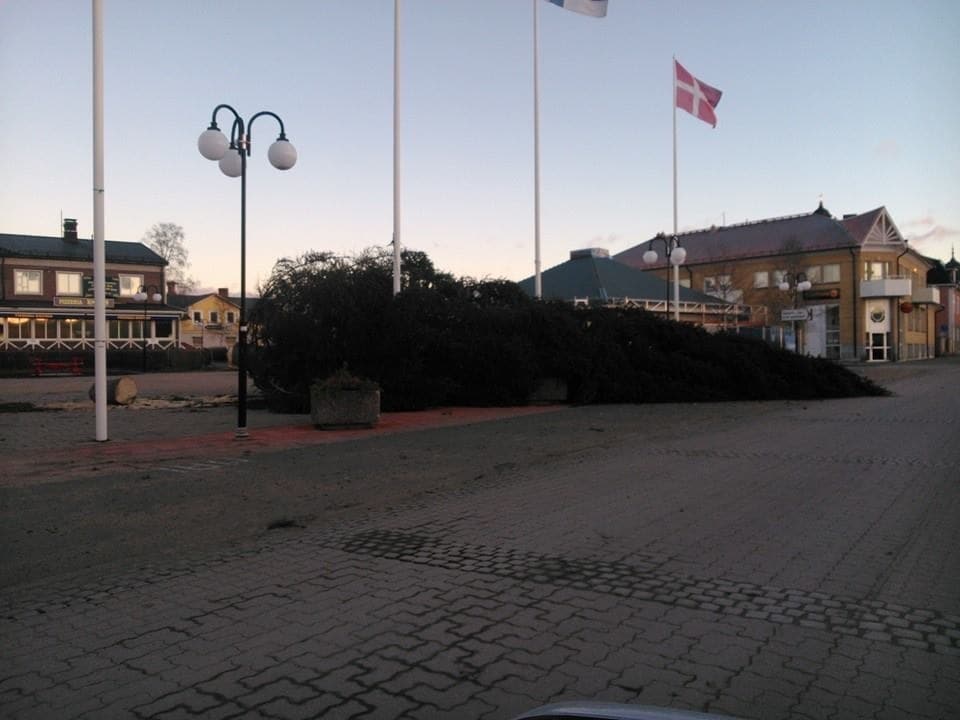 Julgranen på torget i Sveg fick också den som synes känna av Hildes framfart.