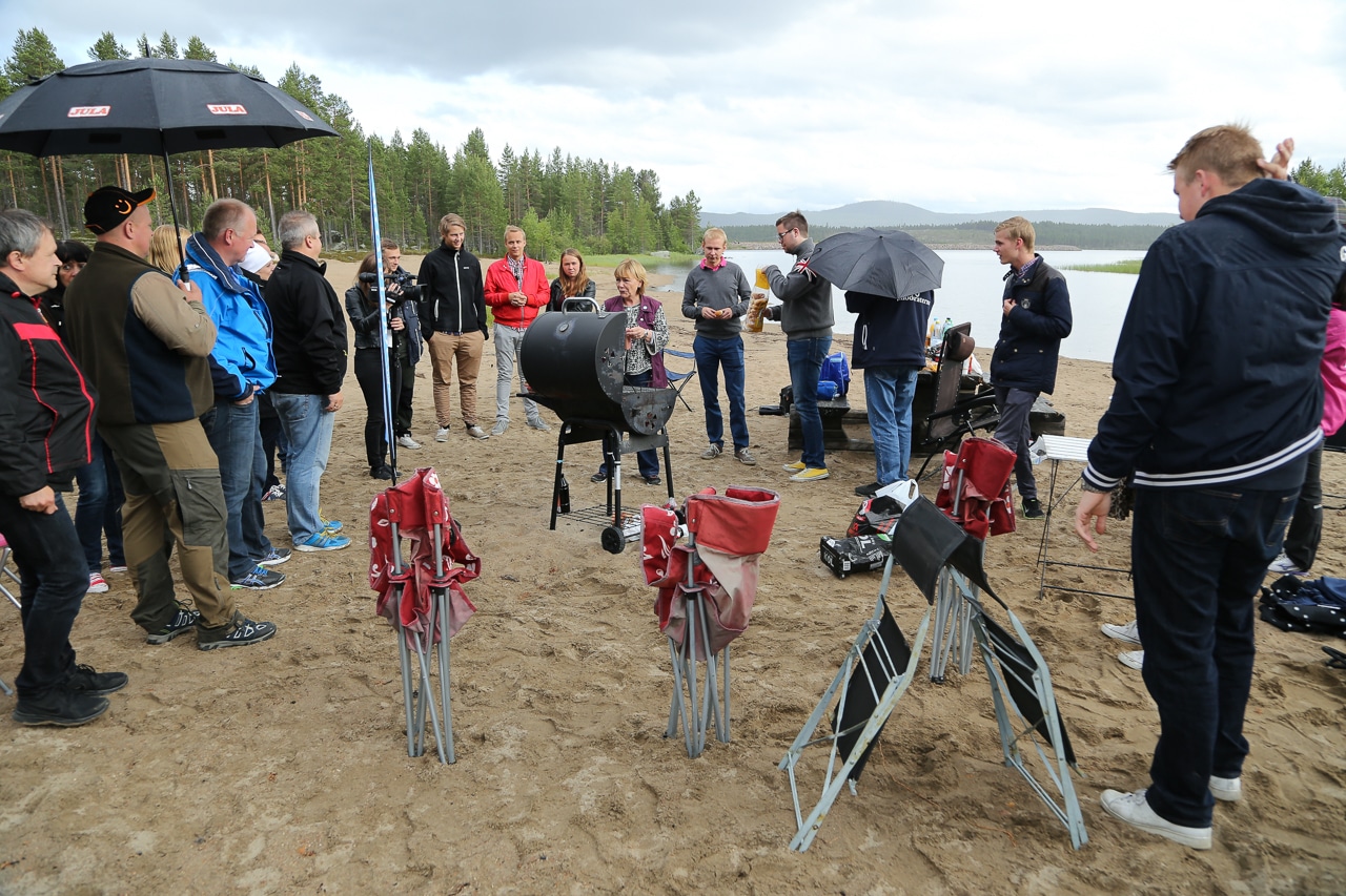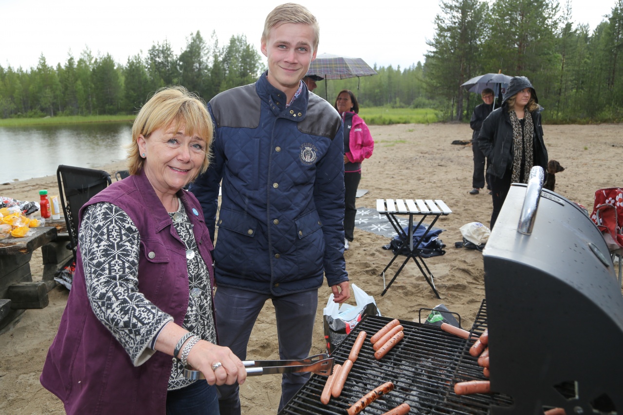 Ett tjugotal personer hade samlats vid badet vid Svegssjön för korvgrillning och en pratstund med justitieministern. Foto: Morgan Grip