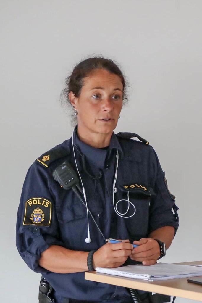 Jana Solsten från polisen informerar om att det finns 20 poliser på plats och att de har stöd av sin stab i Östersund. Polisen har under morgonen evakuerat byn Huskölen. Foto: Morgan Grip