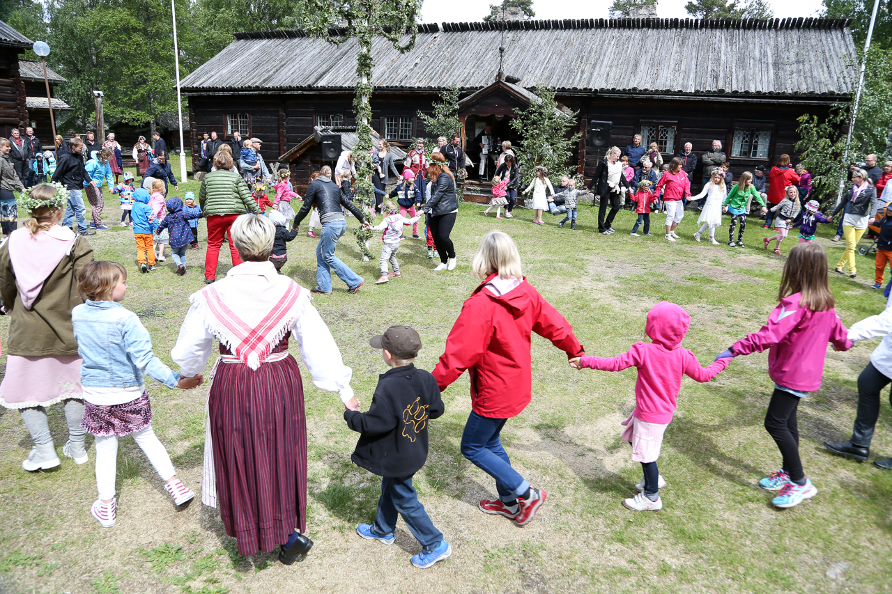 Klockan 12.30 på midsommaraftonen restes stången på Gammelgården i Sveg där många hade samlats för att fira, kylan till trots. Hans Ersa hälsade välkommen och gammal som ung deltog i ringdans och sång.