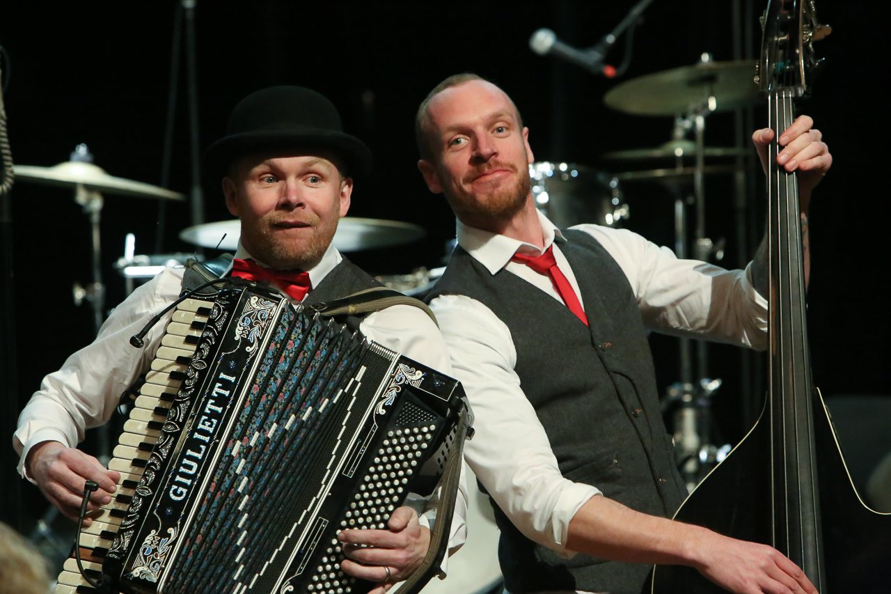 Patrik Zackrisson och Anders Erlandsson höll tillsammans med trummisen Fredrik Magnusson igång skrattmusklerna på publiken som hade tagit sig till Folkets Hus i Sveg. Foto: Morgan Grip
